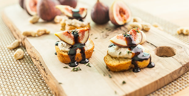 - Spread each base with a heaping teaspoon of cashew cheese, top with a slice of fig and drizzle with balsamic reduction.