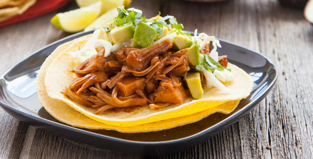 Pulled jackfruit is the star in this delicious plant-based vegan taco recipe. Quick and easy to prepare, it makes a great weeknight dinner. Top with your favorite taco toppings, and even the diehard meat-lovers in your family will love it.
