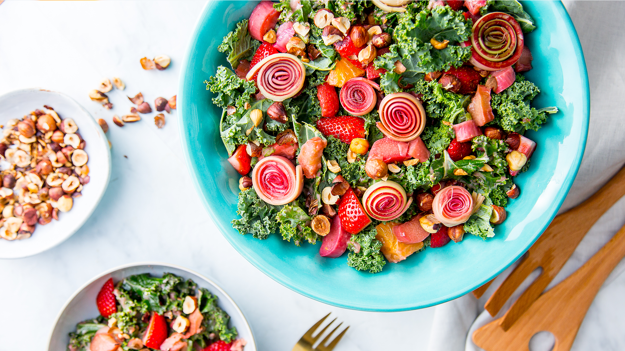 Did you know rhubarb has a savory side? Balance out earthy greens with sweet summer fruit and a perfectly tart rhubarb vinaigrette. This dressing makes enough to serve 8 to 10 people. Feel free to keep it in your fridge for lunch salads for up to a week.
