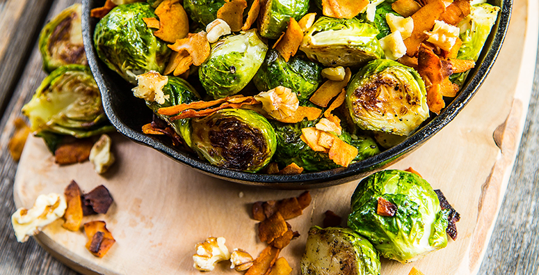 Bacon-everything is a trend that seems to be here to stay. Hop on the bacon and Brussels sprouts train—plant-based of course. Chef Morgan’s coconut bacon adds flavor and crunch to these roasted Brussels sprouts.
