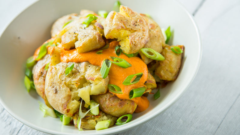 • Smashed Potatoes with Red Pepper Aioli